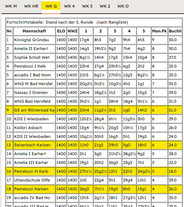 Ebenfalls 6:4 Mannschaftspunkte aber weniger Buchholzpunkte und damit Platz 13 für die Selzerbachschule Klein-Karben.