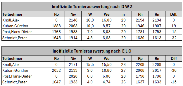 Und damit wurden die folgenden individuellen Ergebnisse nach DWZ und ELO erspielt: